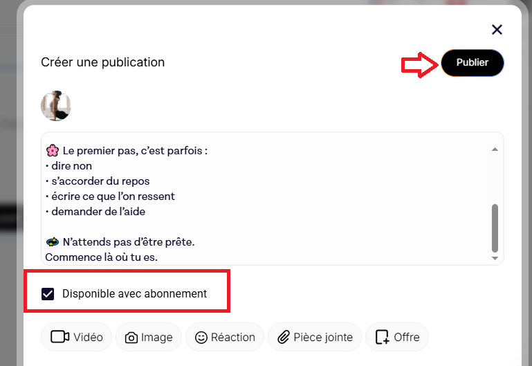 - Pour rendre le post accessible uniquement aux abonnés, cochez Disponible avec abonnement avant de publier.