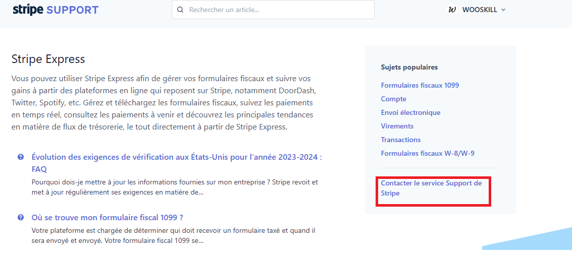 Si vous souhaitez contacter le support Stripe, veuillez suivre ce lien : https://support.stripe.com/express, puis cliquer sur « Contacter le service d’assistance Stripe ».